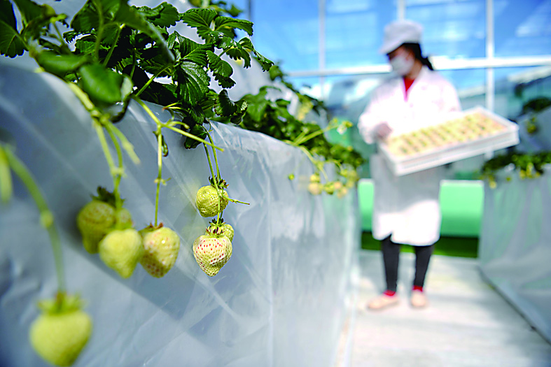 ▲3月27日,在双滦区偏桥子镇偏桥子村草莓种植基地,工人在采摘“白草莓”。 新华社发/王立群 摄