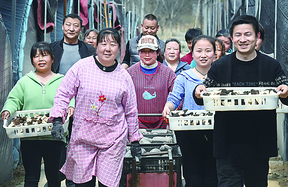 ▲3月16日,刘嘉(右一)与员工在大棚里采摘新上市的羊肚菌,满载而归。新华社记者/陶明 摄