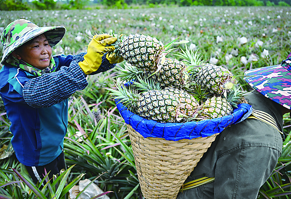▲3月27日,工人在文昌市东阁镇田间采摘凤梨。 新华社记者/郭程 摄