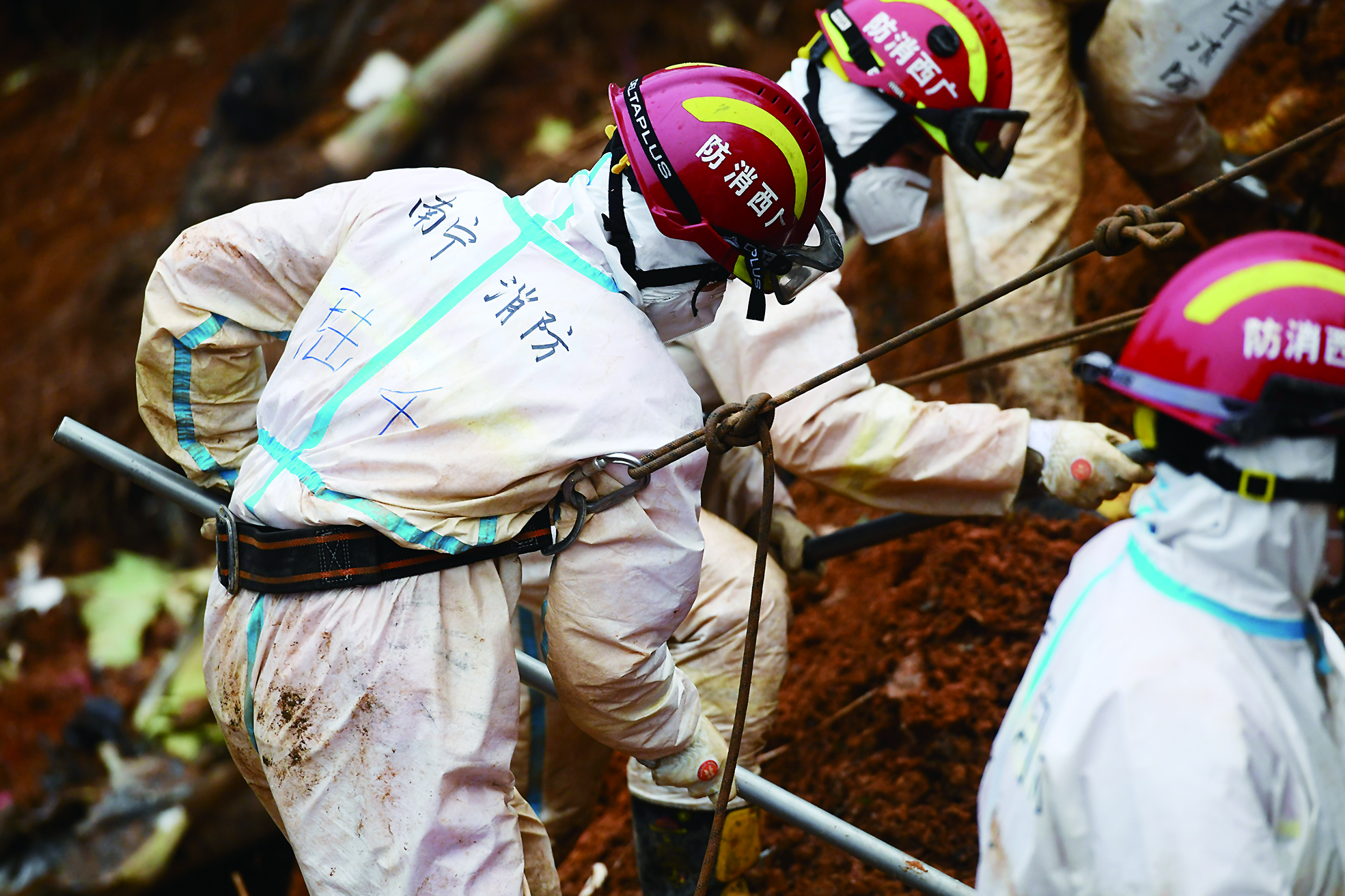 ▲3月26日,搜救人员腰间系着安全绳进行搜索。新华社记者/陆波岸 摄