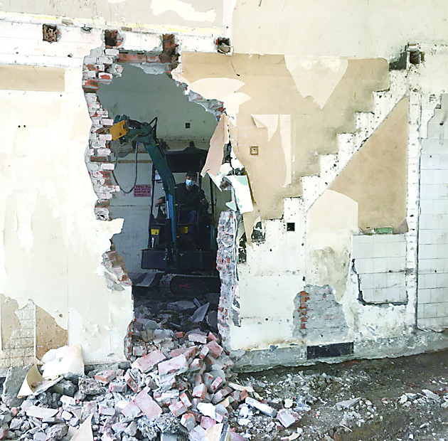 ▲施工人员操作镐头机拆墙。记者/刘平 摄