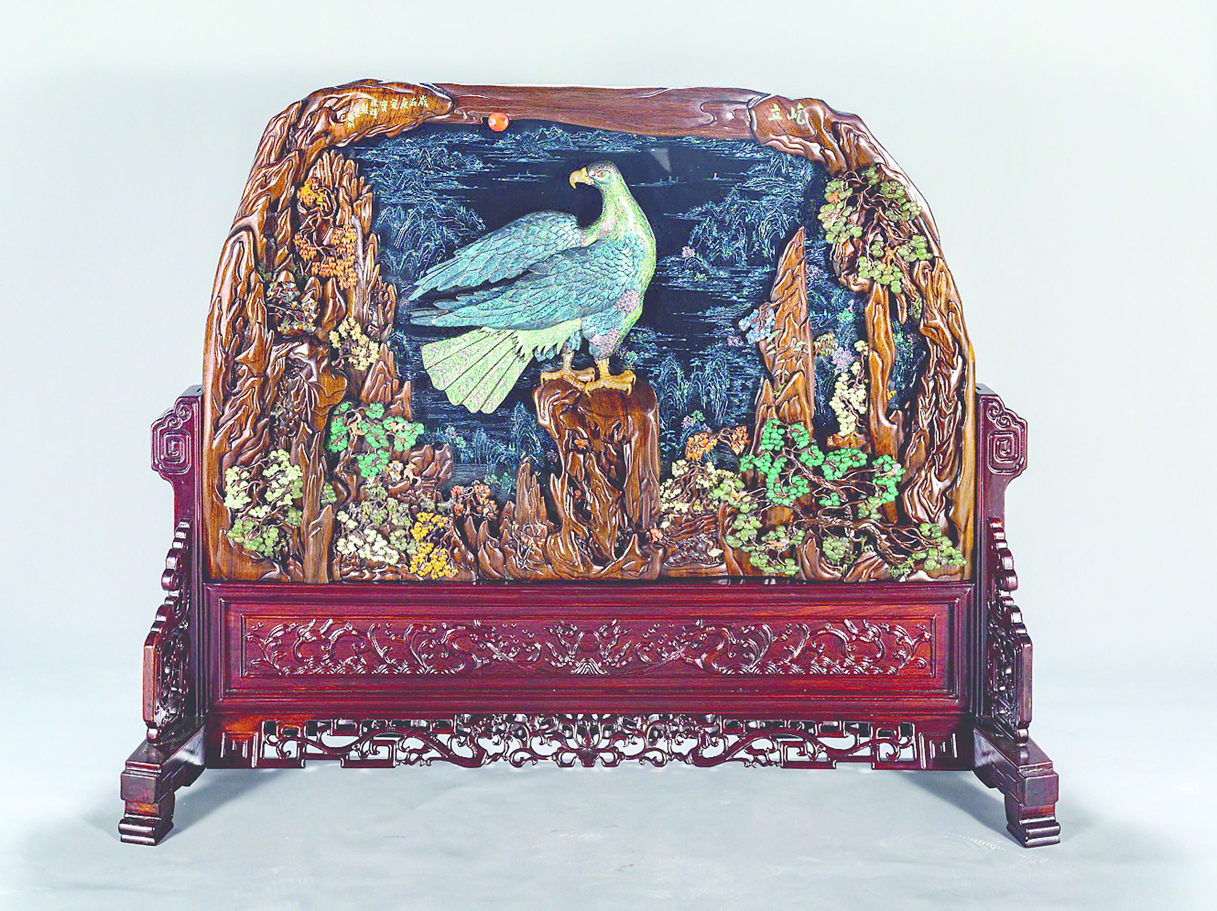 漆器《孔雀》 阚凤祥从艺三十年,他将漆器当作自己看世界的万花筒,每一件作品都反映了他眼中真性情的大千世界。作品《孔雀》在雕漆工艺基础上,选用翡翠、玛瑙、白玉、青金、紫金、碧玉、芙蓉玉、孔雀石等数十种高档玉料,雕琢成孔雀、崖壁、花树等浮雕图案镶嵌在雕漆锦纹之上。作品融高浮雕、浅浮雕、线刻等多种雕刻技法于一体,其切、割、起、铲、剔、刻等刀法运用娴熟,栩栩如生的孔雀衬托了主题画面,意寓雍荣华贵、吉祥和谐。屏风造型古朴雅致、工艺细腻精巧,配以精致的红木雕花底座,整体和谐统一。(本报综合)
