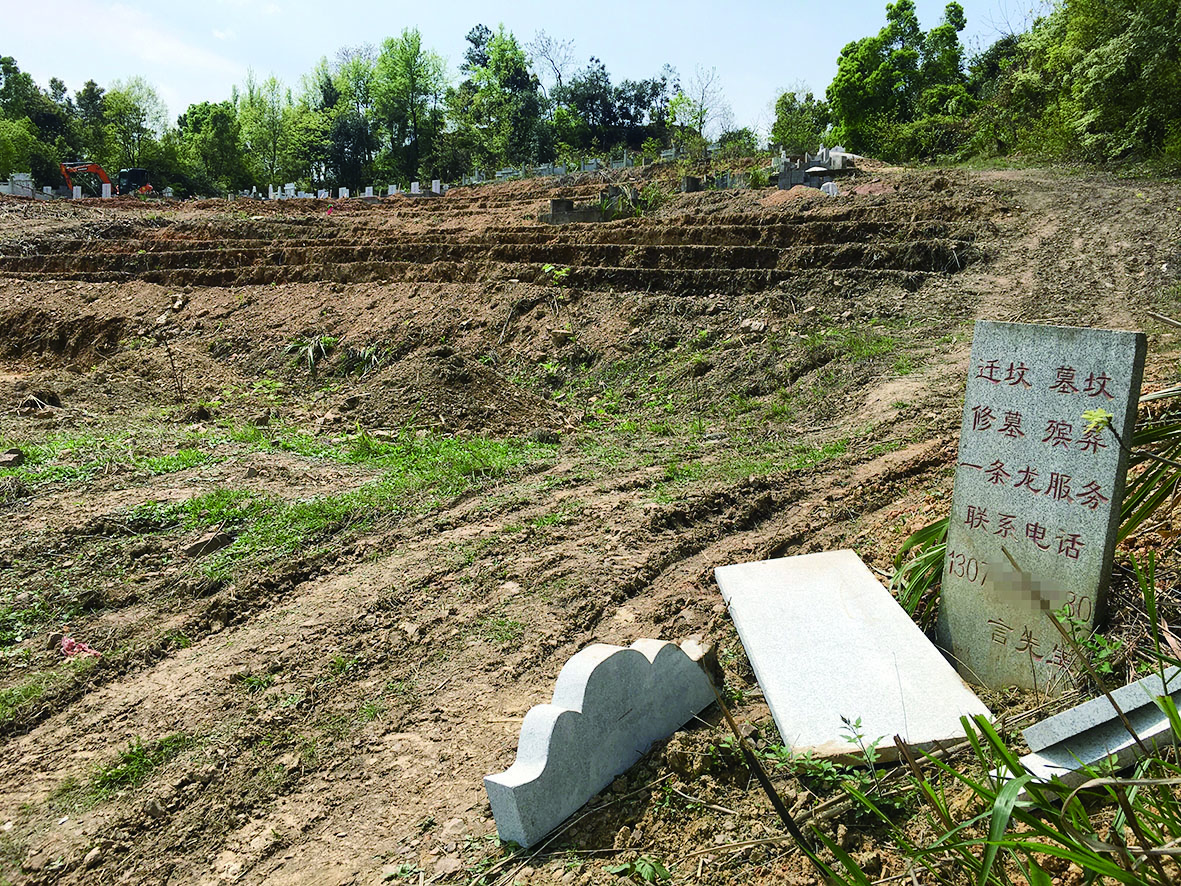 8组一片当地居民的自留山上,出现大规模建坟、修坟现象,并动用了挖掘机施工。建坟区域,黄土裸露,呈梯田状,竖立有数十块墓碑。建坟区域的路口处,竖立着石碑,上面刻有“迁坟、墓坟、修墓、殡葬一条龙服务”和联系电话。附近居民称,这些墓穴对外销售,当地俨然衍生出一条葬坟“产业链”,还有人介绍“业务”。