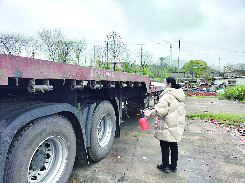 此时接近中午12点,谭寓展带着李薇、易迎香再次来到清水塘大道,引导货车前往3公里外的建设村村部。到达目的地后,三人立即对该货车进行消毒。在与建设村村部交接时,村部工作人员提出,近期街道正在做全员核酸的准备工作,村部前坪是备选场地,如果开展核酸检测,大货车停放在这里影响很大,因此,他们建议将大货车引导到附近楼盘的空旷场地。
