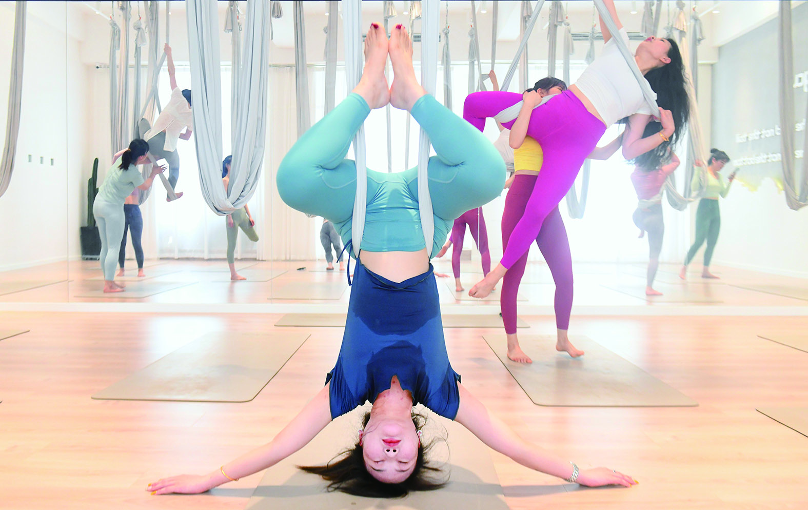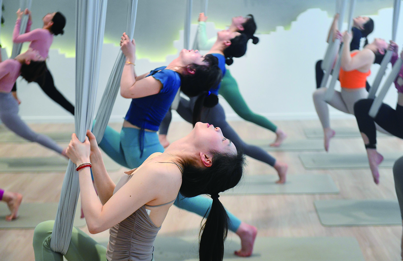 瑜伽馆里,初学者们在老师的引导下,专心地练习下蹲式、低弓步、鸽子式、猫牛式等动作。有了基础的小姐姐们,则对自己设定了更高的要求和挑战,狂野式、蛙式倒立、空中瑜伽,再难的动作也要一个个攻克。