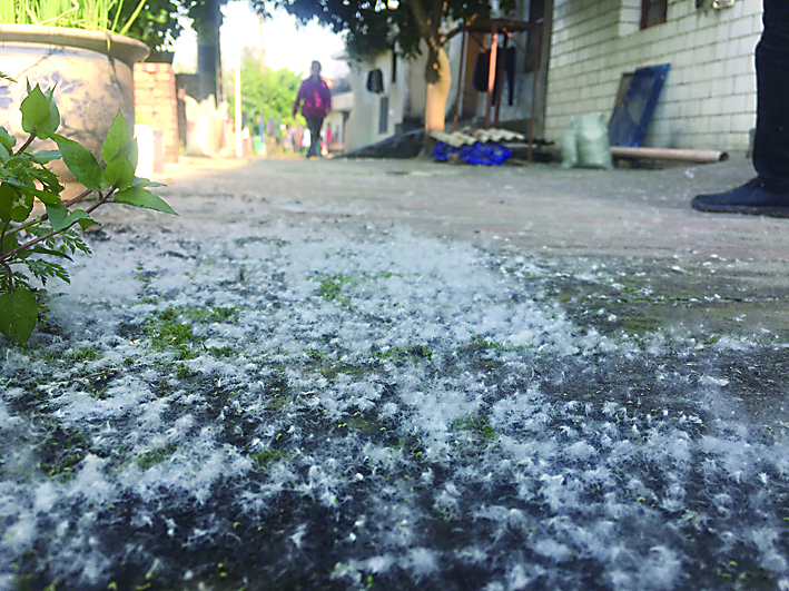 ▶下河老街地上有厚厚一层柳絮。 记者/刘平 摄