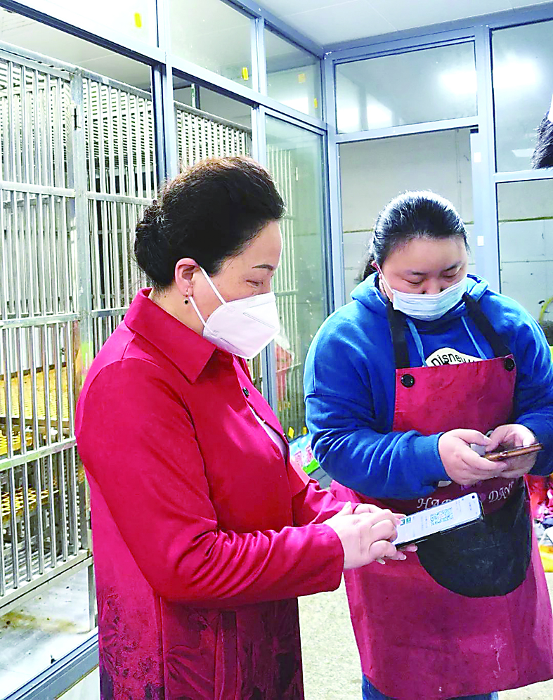 ▲谢小红(左)在市场检查经营户的行程码。 通讯员供图