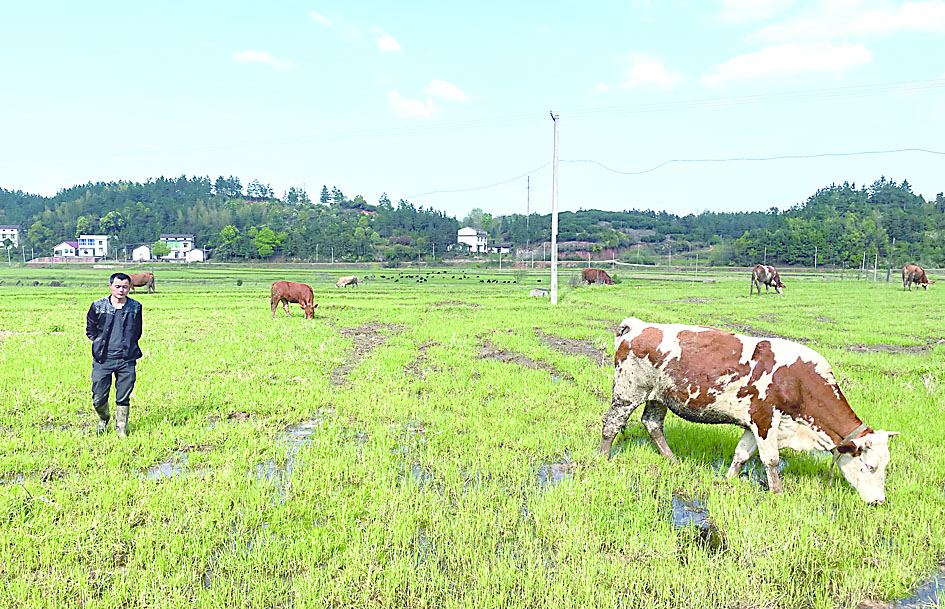 ▶只要天气好,郭日新就会把牛放出来吃草。 记者/杨如 摄