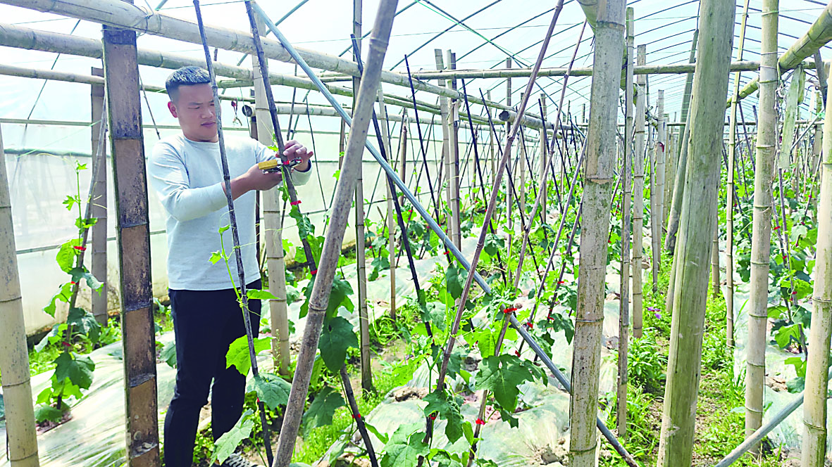 ◀4月6日,袁鹏在给丝瓜整枝上架。 记者/杨凌凌 摄