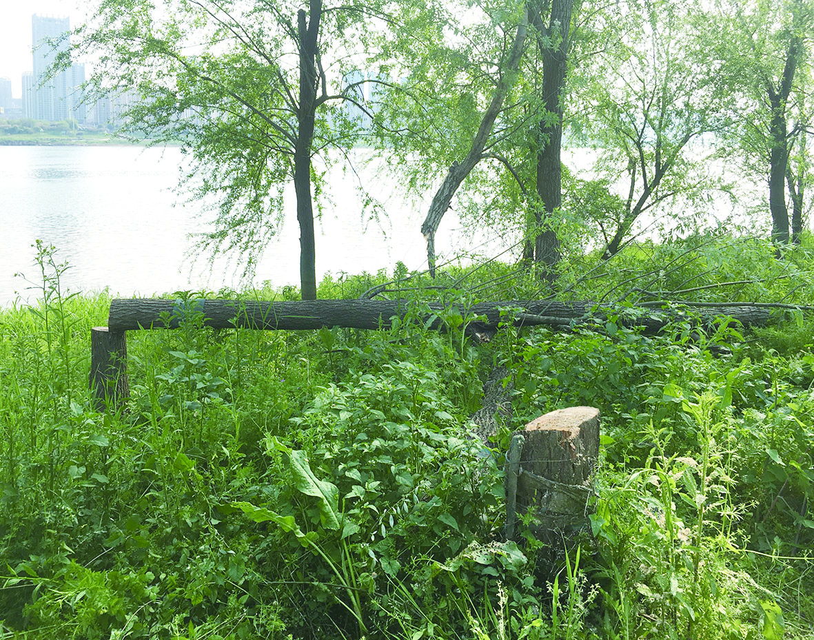 ▲两株柳树被人为锯断。记者/刘平 摄