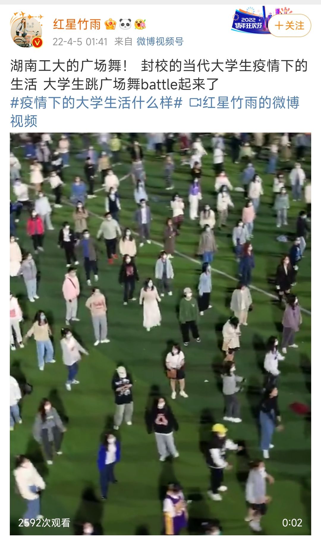 4月3日,湖南工业大学封校期间,学生们戴着口罩相约操场,在校园中跳起广场舞。视频中,众人秒变舞蹈天团,喜感十足。有网友称:“疫情也阻挡不了火热的青春,谁能拒绝当代大学生的校园广场舞表演呢!”
