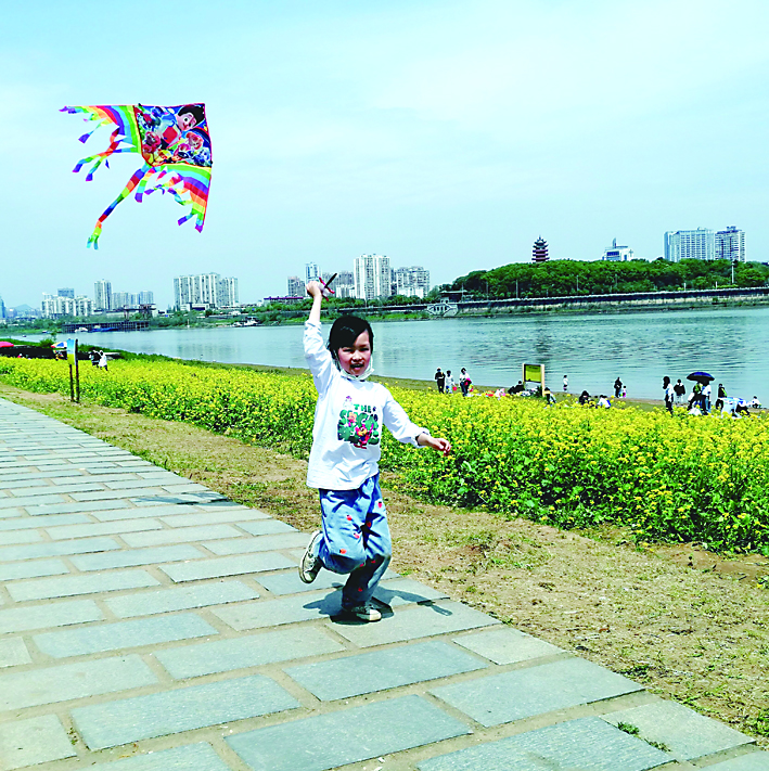 ◀湘江风光带,小孩子在放风筝,也放飞心情。 通讯员/吴东沙 摄