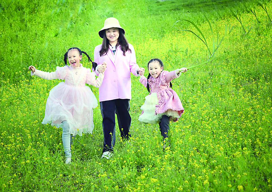 ▲4月4日,一位妈妈带着两个孩子来到株洲网红打卡地——湘江风光带油菜花海,亲近春意盎然的大自然。 通讯员/王多红 摄
