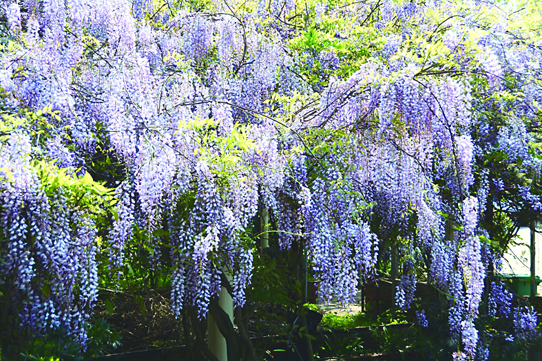 ▲荷塘区杨家寨的紫藤花盛开怒放,那一簇簇的花就像一串串紫色的葡萄挂在木架上,清香诱人。 网友/神龙宝刀 摄