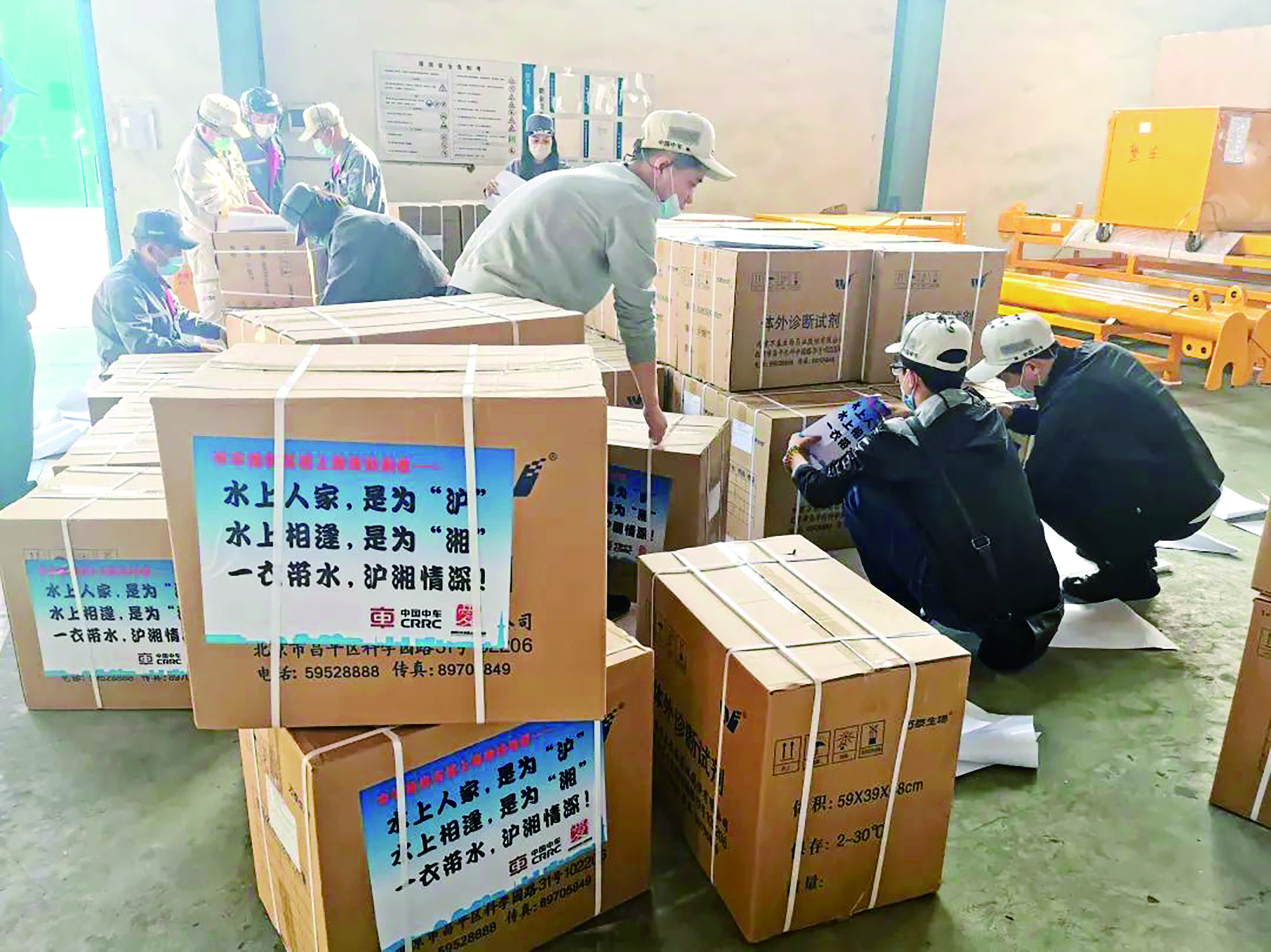 ▲中车株机职工正在对防疫物资进行打包装运。企业供图