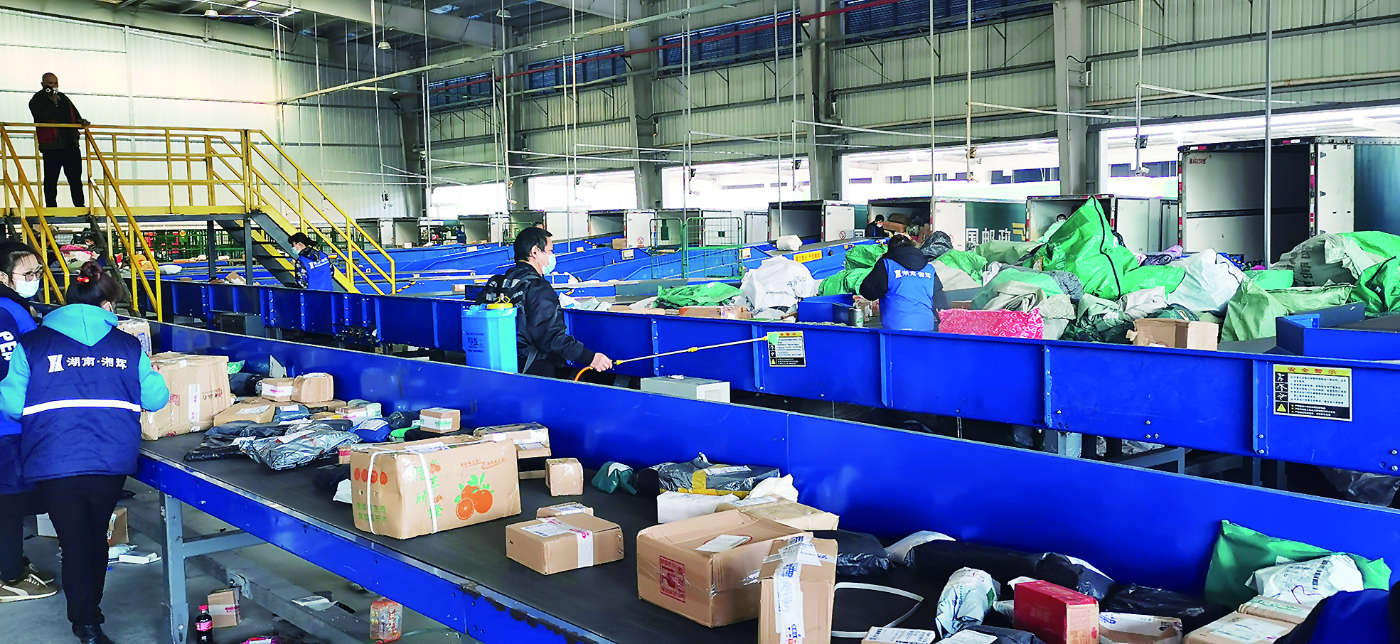 ▲工作人员对包裹进行消毒(资料图)。记者/何春林 摄
