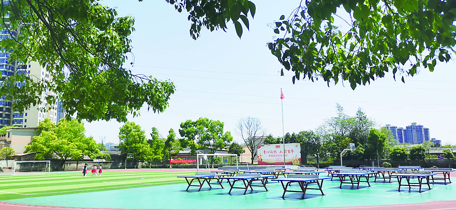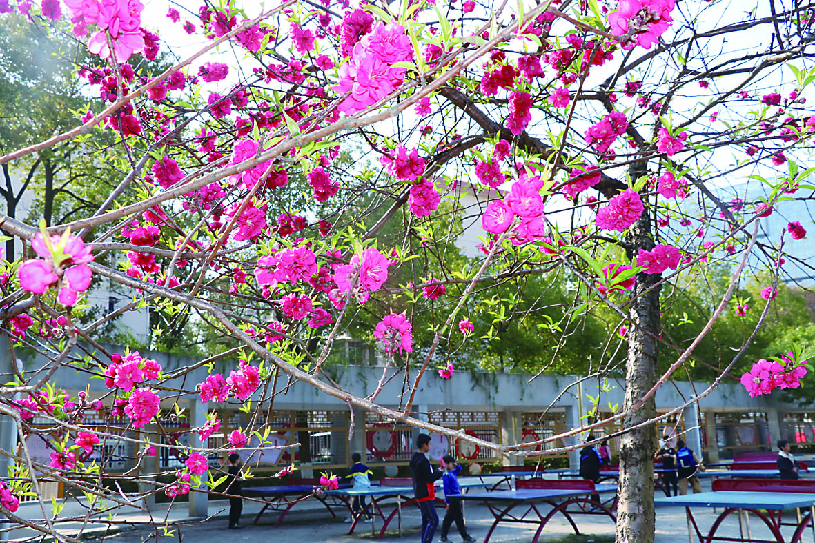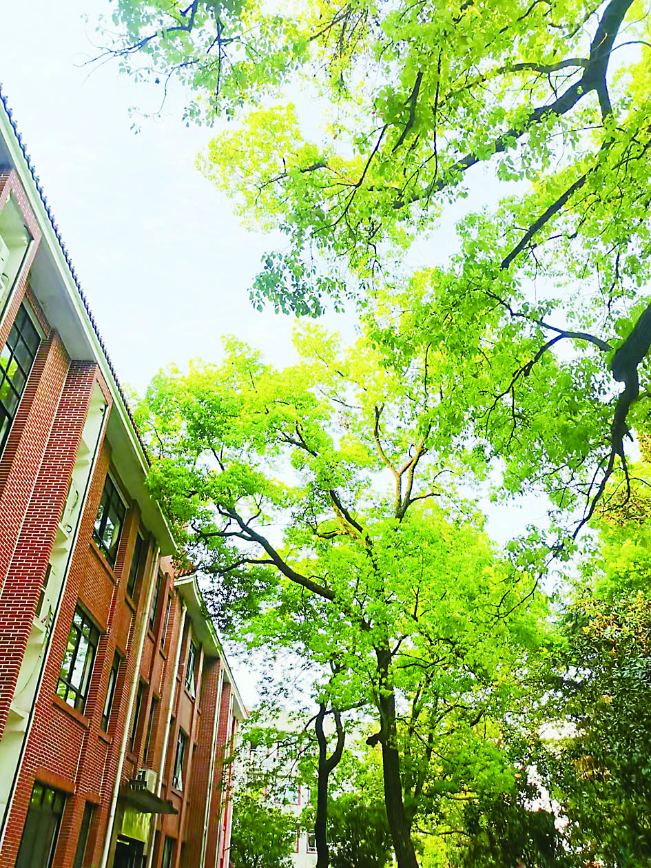 ◀阳光普照,市八中内的红墙绿叶春意盎然。 记者/戴凛 通讯员/钟芳杰 摄