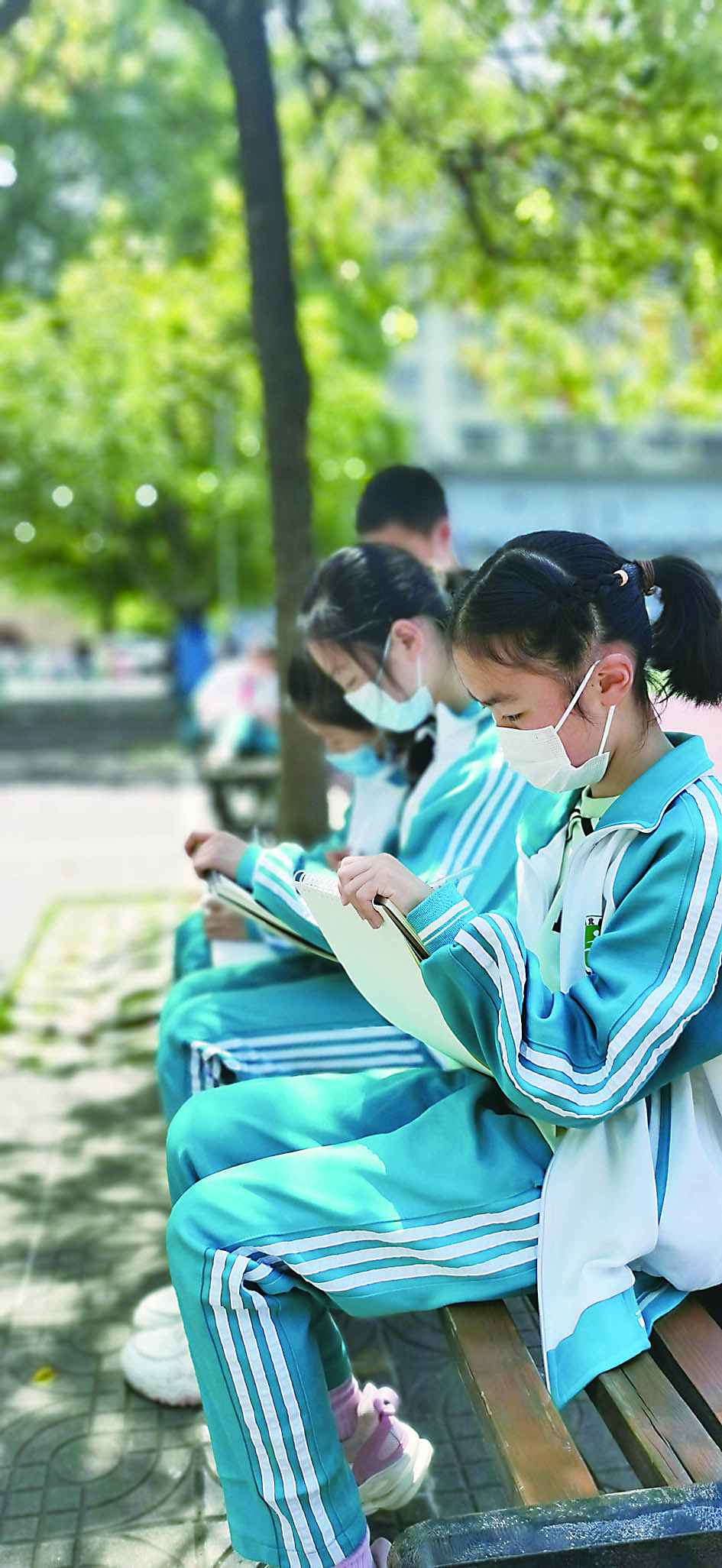 ▲绿荫下,石峰区北星小学的学生们用画笔记录下这迷人春色。 记者/孙晓静 通讯员/李红艳 摄
