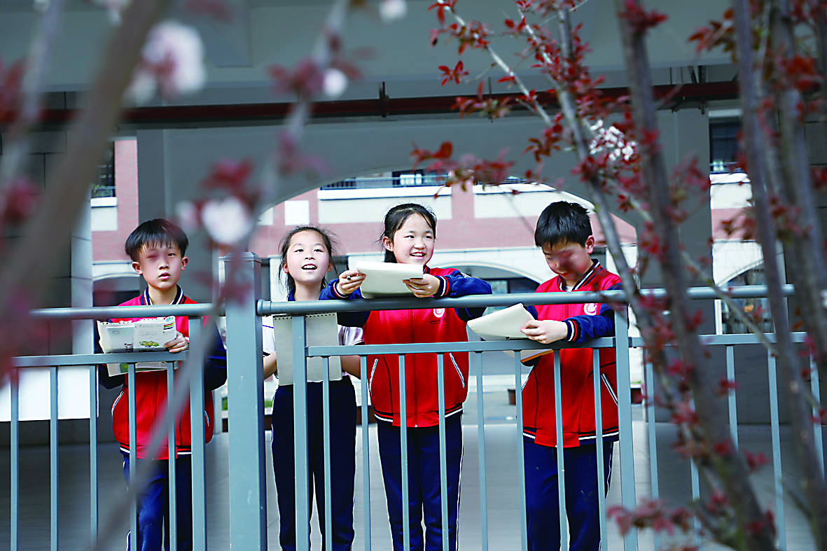 ▲鲜艳的花朵下,天元区泰山学校的学生们在肆意享受课间时光。 记者/孙晓静 通讯员/郭泽妤 摄