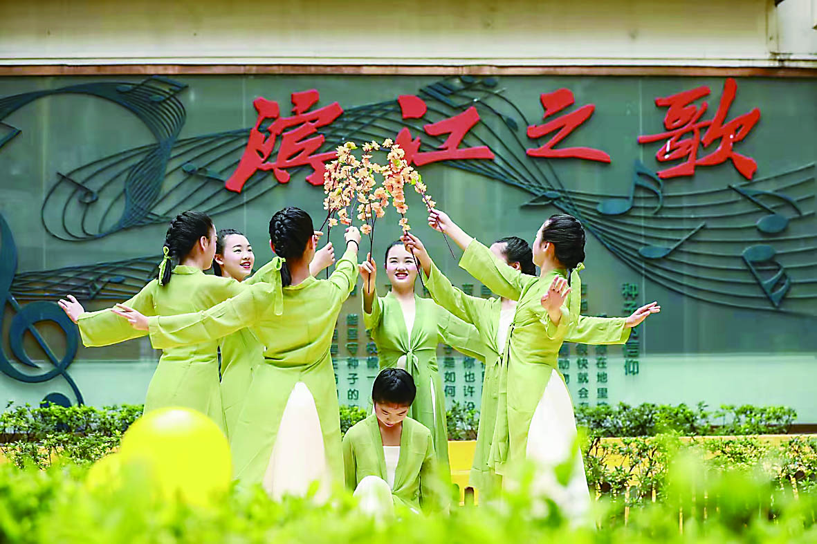 ▲手持一支花,天元区滨江小学的师生用舞蹈歌颂对母校的热爱。 记者/孙晓静 通讯员/雷蕾 摄