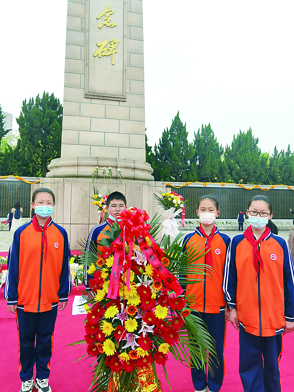 4月5日,石峰区曙光学校举办“清明祭英烈”活动。和往年不同,今年该活动仅由部分优秀少先队员、校园记者参与。在烈士纪念园,学生们为纪念碑前敬献花篮,默哀致敬,并在现场庄严宣誓:一定继承革命遗志,为中华民族的伟大复兴努力学习知识技能、磨炼意志,做新时代好少年好公民。图为学生为纪念碑敬献花篮。