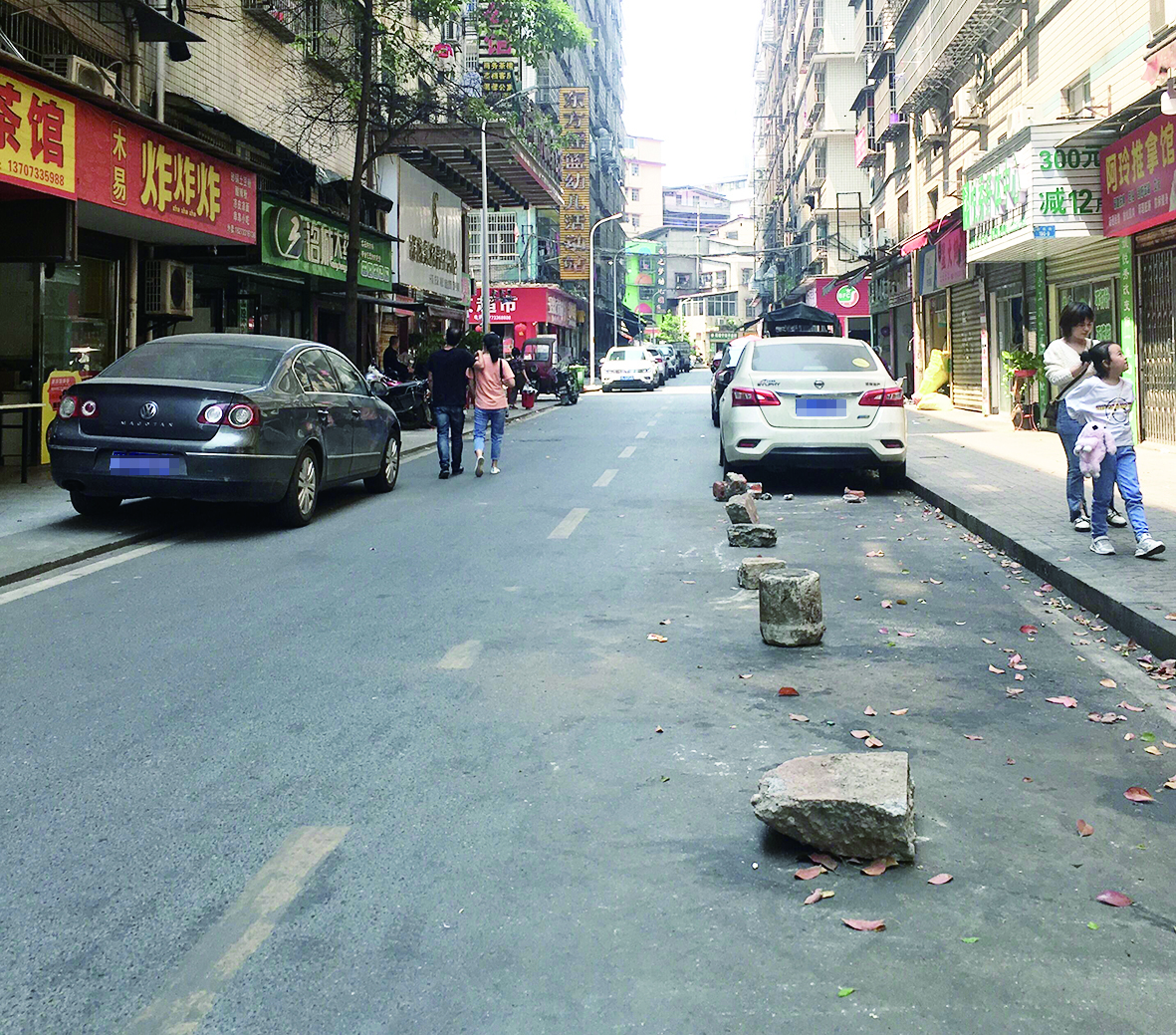 有商户反映,石块是由一些临街商户摆放,防止车辆违停在店面前路边。石块占道现象已出现很长时间,盼望管理部门予以清理。