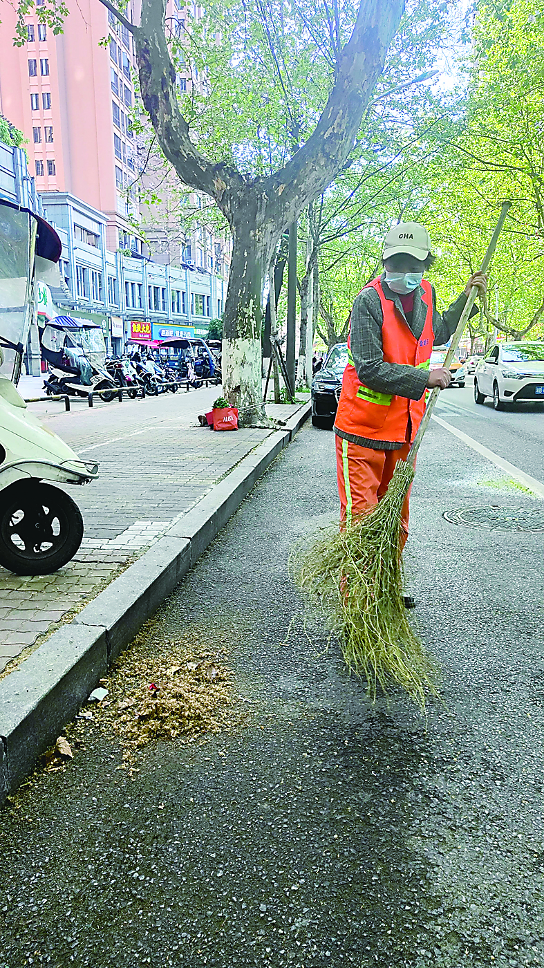 ▲环卫工在清扫路面上的梧桐飞絮。 记者/马文章 摄