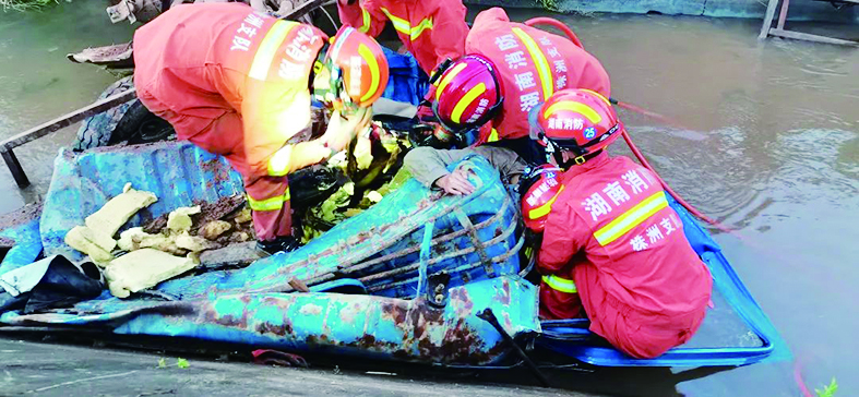 当天下午5时许,救援人员看见,一辆载有挖掘机的货车横在河道中,货车驾驶室严重变形,驾驶员双腿被死死卡在方向盘下,动弹不得。好在河水较浅,没有没过车顶,由于长时间浸泡在水中,驾驶员出现脱水症状,情况危急。