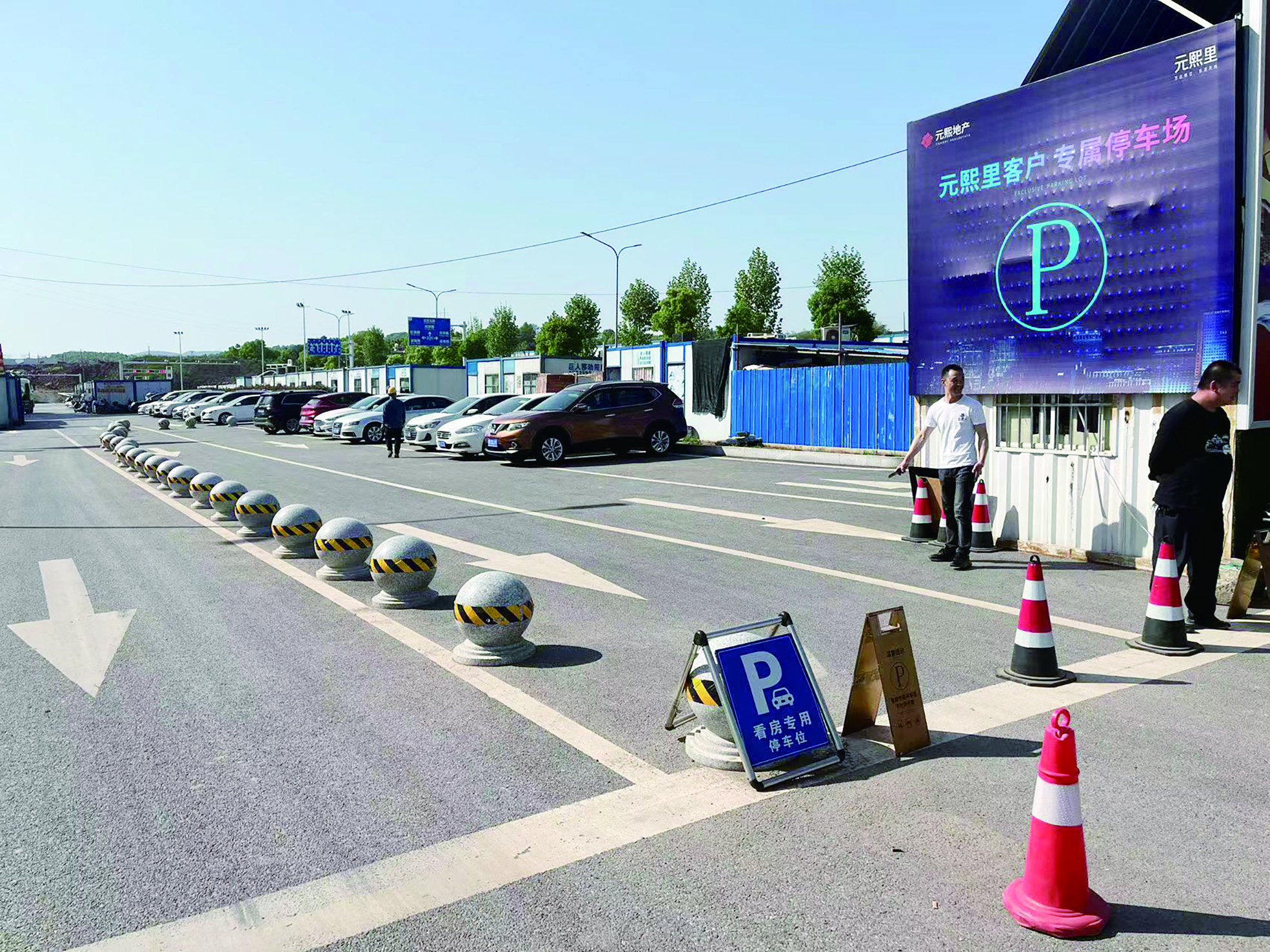 记者前往李先生反映的区域发现,确实如李先生所说,该路段的一部分马路被石墩圈出了一块,附近赫然挂着一块“元熙里客户专属停车场”的告示牌,在石墩旁边也立着“看房专用停车位”的告示牌。
