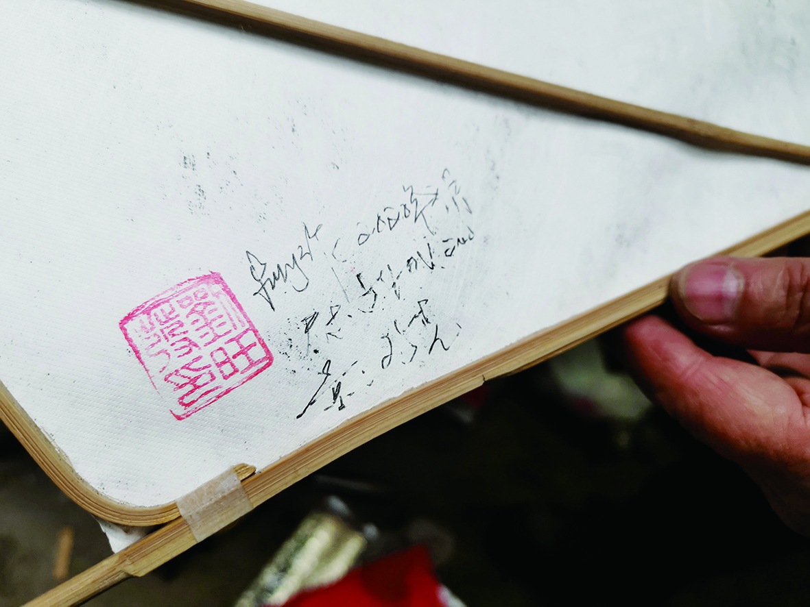 ▲在风筝一角,刘旺发会写下制作时间和重量等数据信息。 记者/戴凛 摄