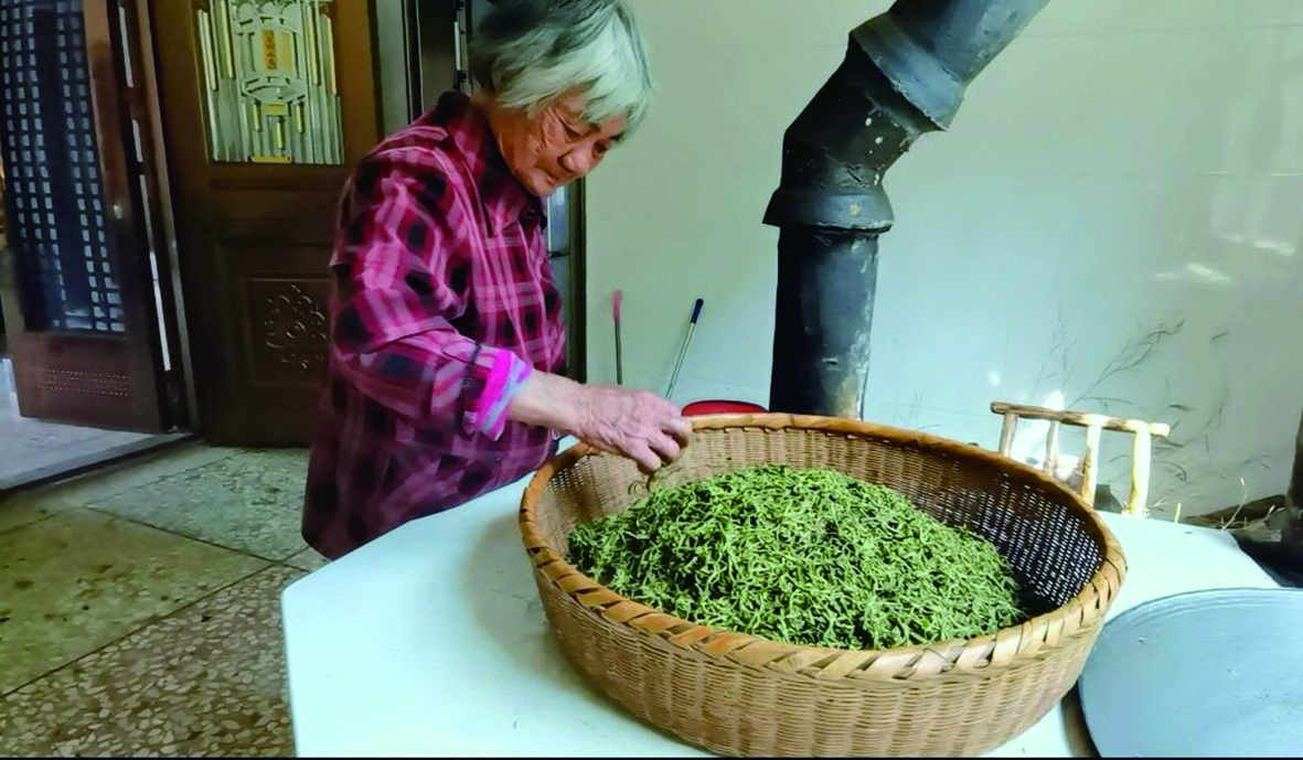 ◀老人在摊晾野茶叶。