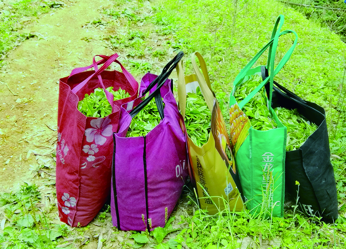 ▲袋子里装满了嫩绿的野茶叶。