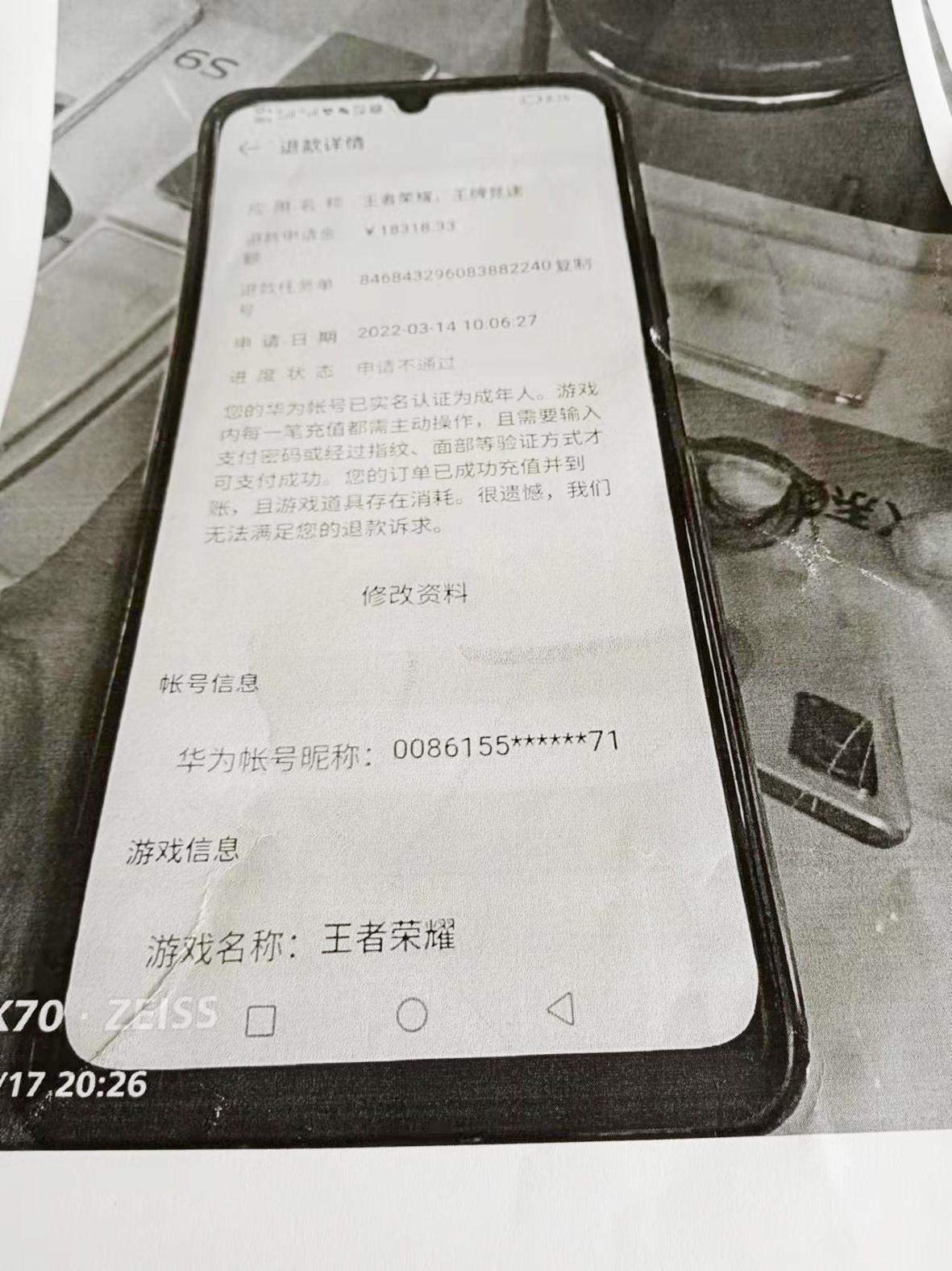 ▲黄女士申请退款,被游戏平台拒绝。受访者供图