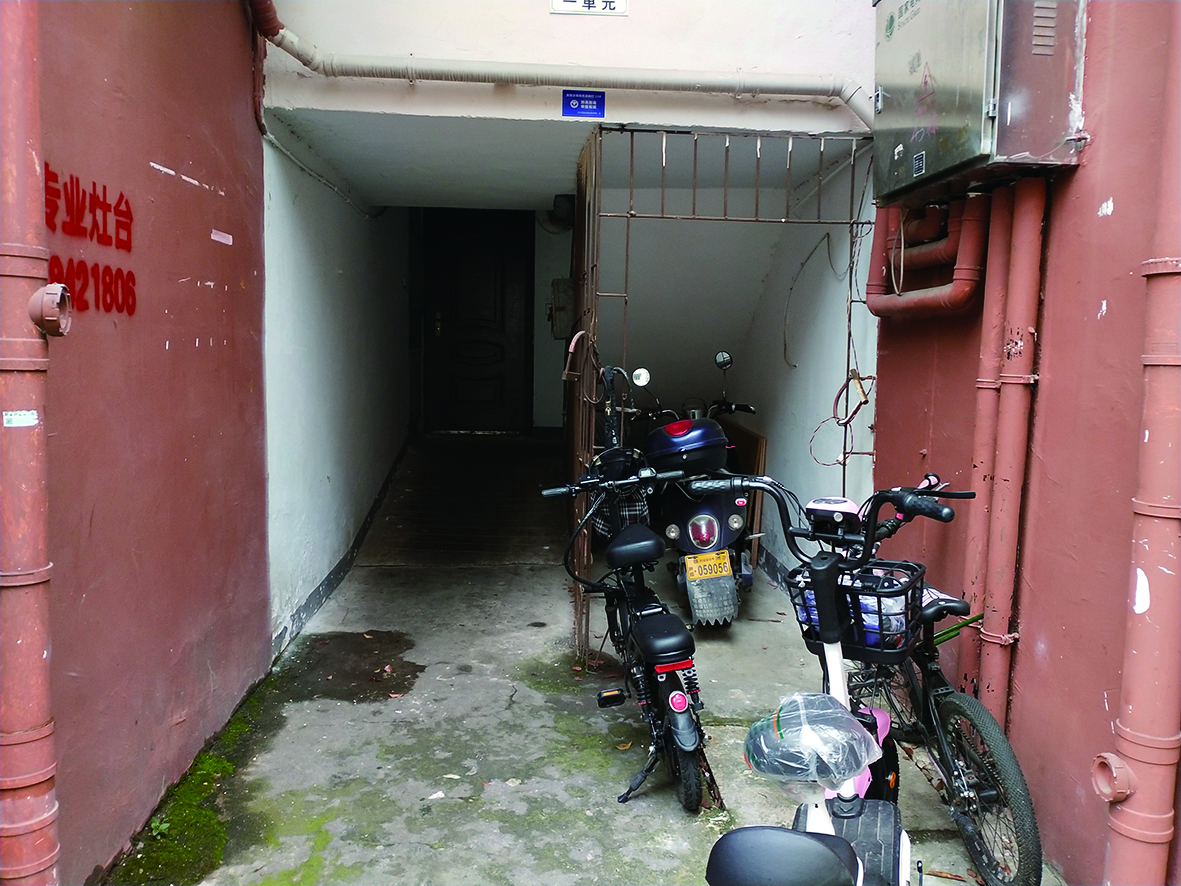 ▲铁路小区某楼栋单元入口堆放的电动车。记者/廖智勇 摄
