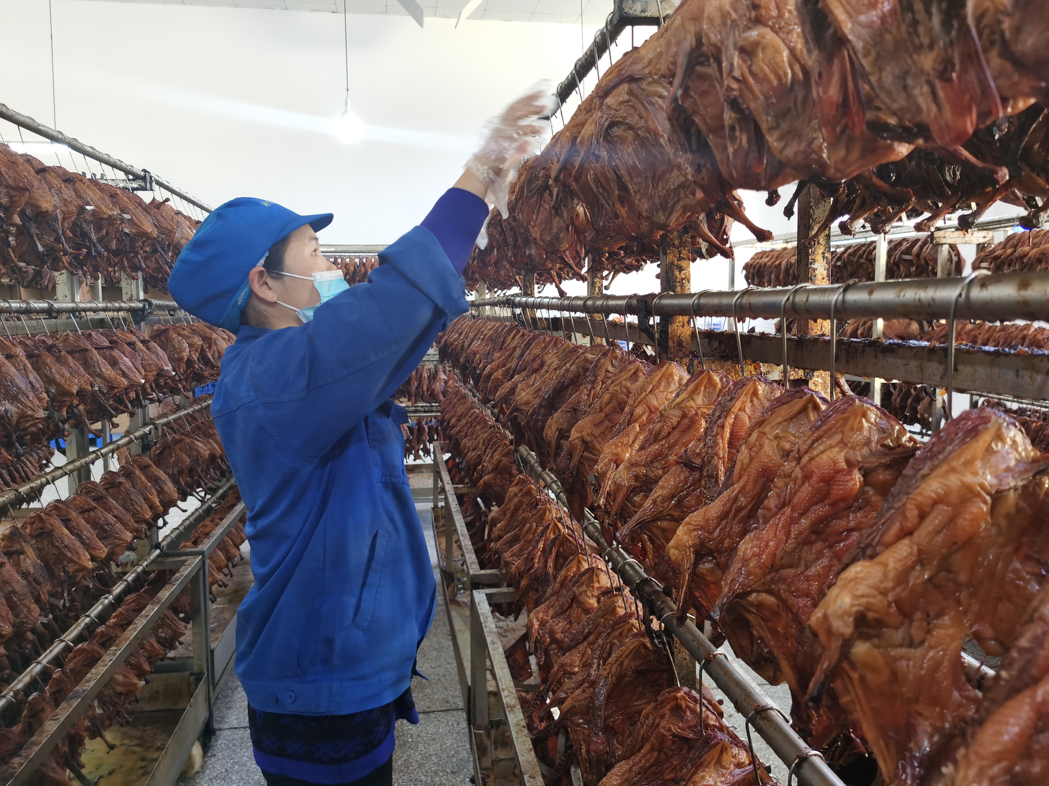 “公司将传统工艺与现代科学技术结合,研发了全省唯一、独具特色的全自动高温烘烤生产线,日产酱板鸭可达10000只。”润湘源食品厂另一名负责人刘建刚说。