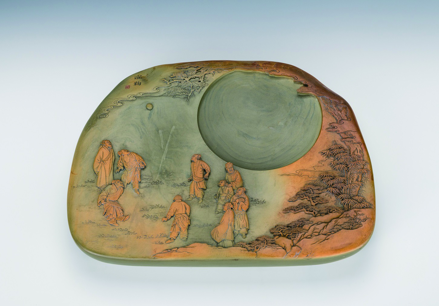 梁佩阳为梁氏砚雕世家传人,从小就随师辈到砚坑采石,鉴别端砚,在传统端砚工艺雕龙刻凤的基础上,致力创新设计和雕刻技法。《蹴鞠》为绿端,石色翠绿,有水波纹,石质滋润、细腻,在砚堂处稍加修饰即与背景融为一体,仿若万里晴空。砚石表层有金黄色石纹,作者因材施艺,用来体现山石、树木、人物和祥云,砚面雕刻有九个人物在郊外蹴鞠娱乐,有老有少,通过个体的形态变化,细腻地表现出人物关系和特点。在砚额部分祥云与树枝交相辉映,自然流畅。整件作品雕刻意在山水雅趣,着重表现郊外游玩之乐。