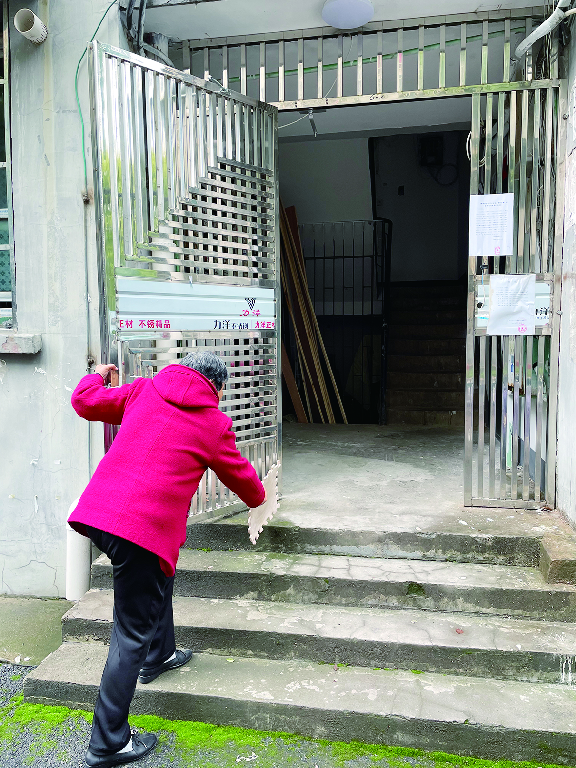 ▲耀华新村安装的不锈钢门没有锁。记者/谢嘉 摄