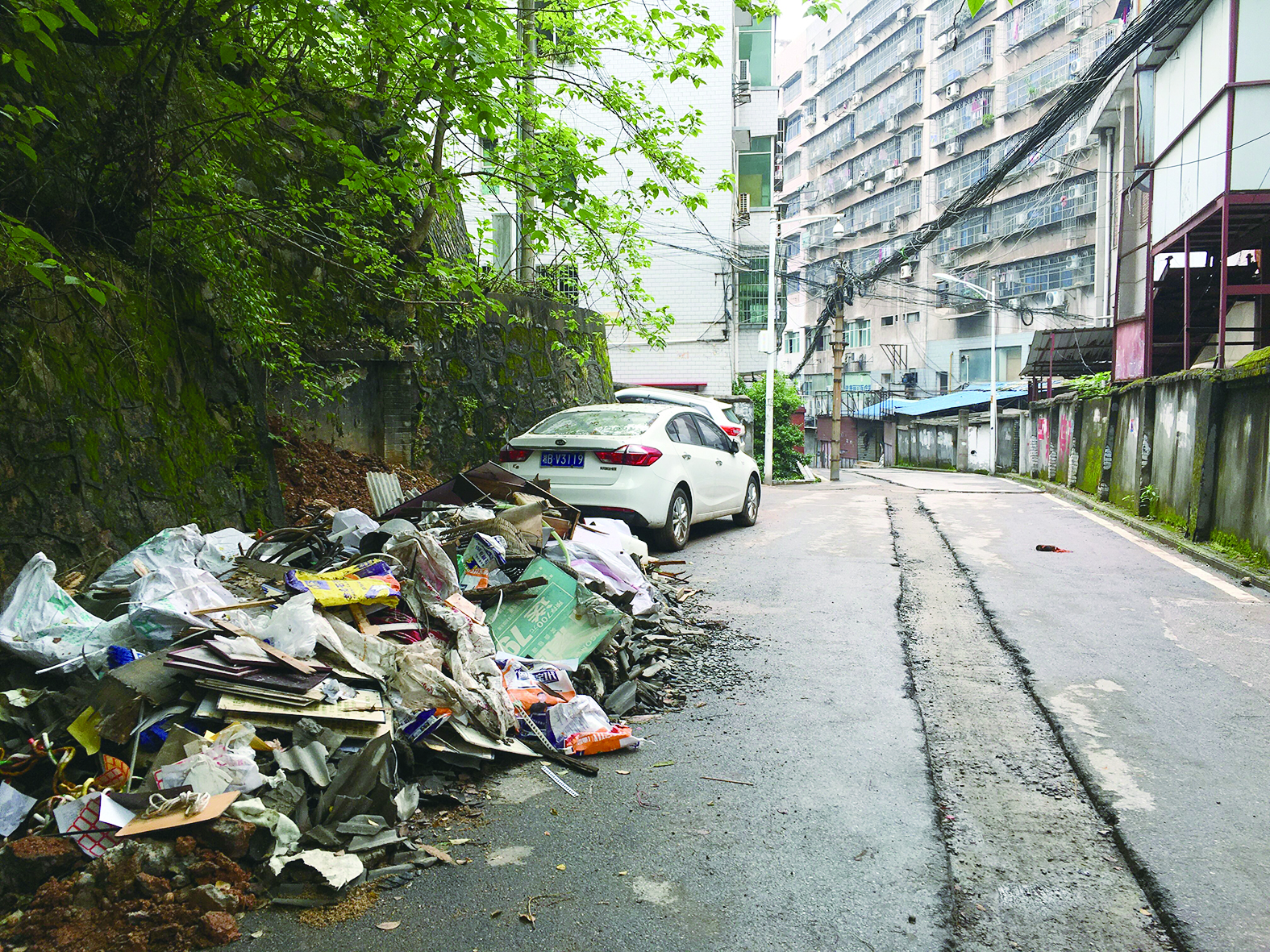 ▲制镜路,路边堆放建筑垃圾。记者/ 刘平 摄