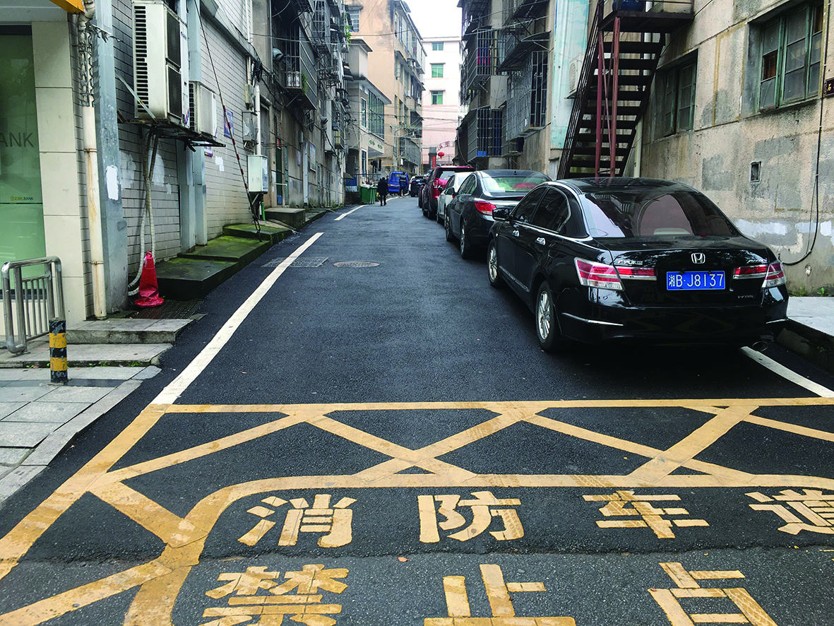 渌口区石子塘巷,路口地面上的“消防车道禁止占用”非常明显,但沿线停放了一排车辆。
