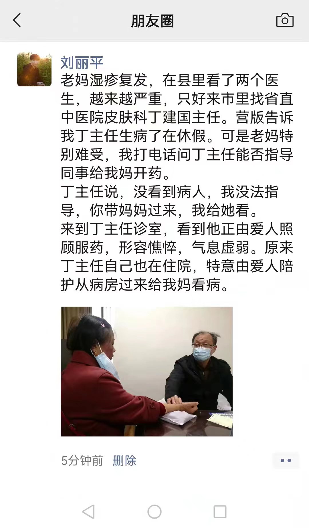 本期话题是“感动!遇到株洲好医生”。前两天,刘丽平发圈说老妈脸部患湿疹,痒痛难受。联系曾治愈老妈这个顽疾的省直中医院皮肤科主任丁建国,他正患病住院,却由爱人陪护来到诊室给老妈看病开药。丁主任说:“自己也是病人,知道生病不好受。”