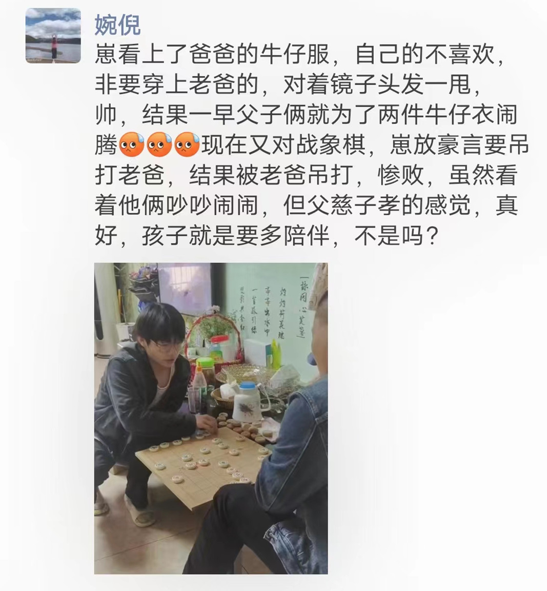 崽看上了爸爸的牛仔服,非要穿,对着镜子头发一甩,帅。父子俩为了牛仔衣闹腾了一早,现在又要对战象棋,崽放豪言要吊打老爸,结果却被老爸吊打,惨败。虽然看着他俩吵吵闹闹,但是父慈子孝的感觉,真好。孩子就是要多陪伴,不是吗?(来自网友“婉倪”的分享)