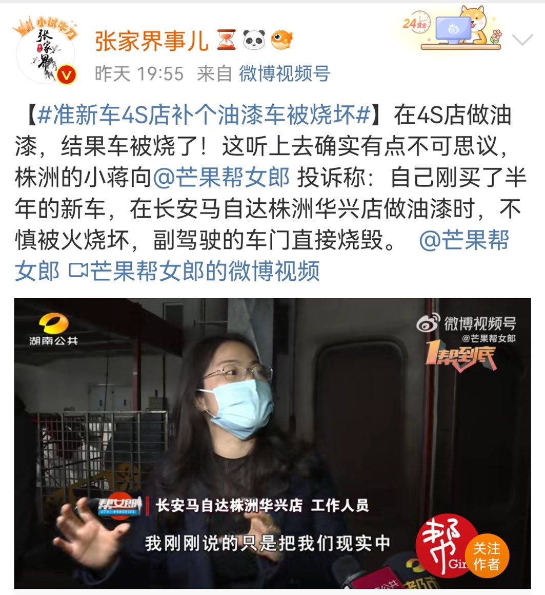 近日,蒋先生刚买7个月的新车在长安马自达株洲华兴店做油漆时,不慎被火烧坏,副驾驶的车门直接被毁。起火原因目前尚不明确,双方还在协商当中。(原视频由微博“芒果帮女郎”提供)