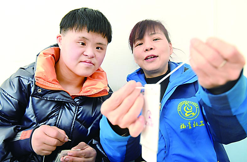 周泉彤在这里工作3年了,是班上的老学员。从前的她胆小不自信,也不愿意与人交流。来到这里,在老师不断地引导和帮助下,现在的她已经愿意与人分享自己的快乐,并且乐于帮助别人。