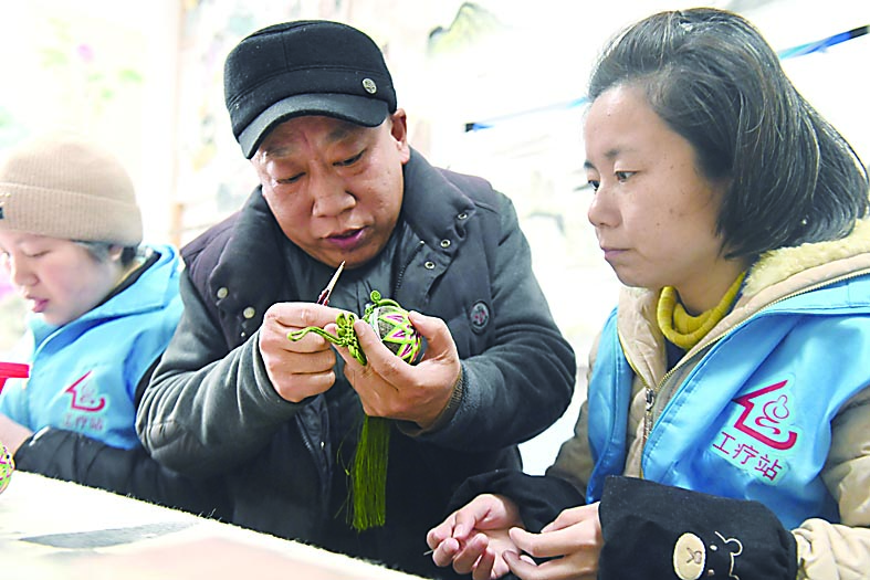 ▲肢体残疾的何健超老师在教学员做绣球。