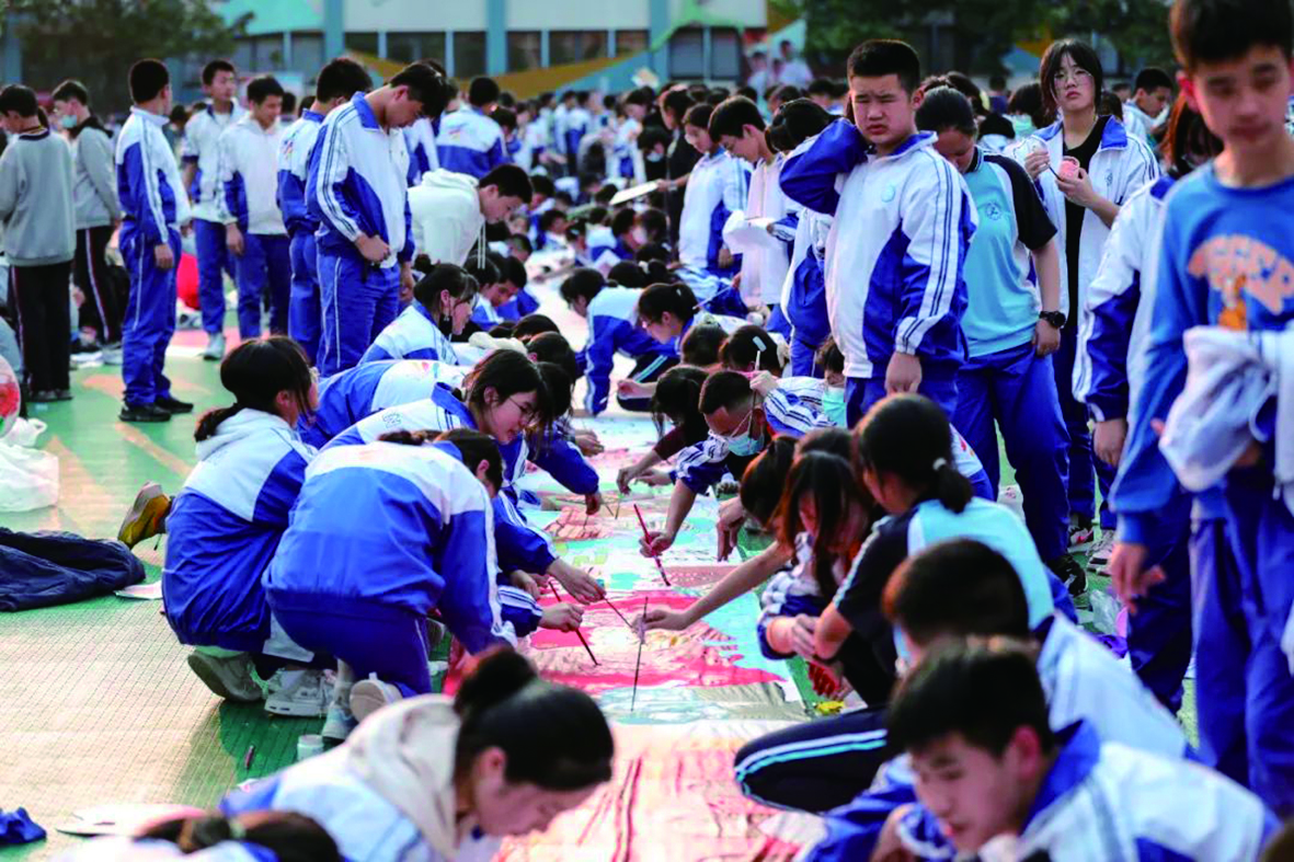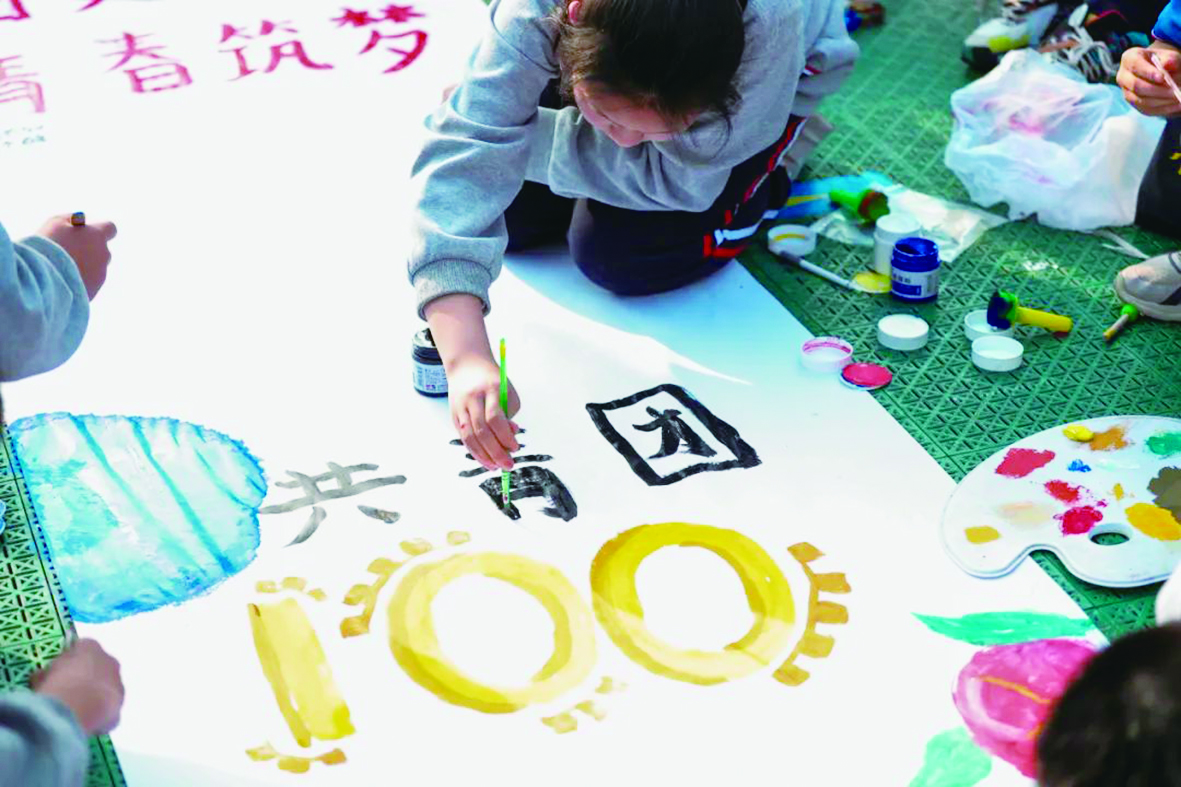 “我来调个色”“你画这部分,我画那部分”……4月19日下午,景炎学校操场人头攒动,热闹非凡,千名学子采用书法、绘画的形式,向中国共青团建团百年献礼。