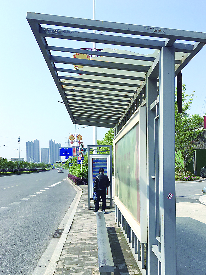 ▲云龙大道边,部分公交车站候车棚顶部有窟窿。 记者/刘平 摄