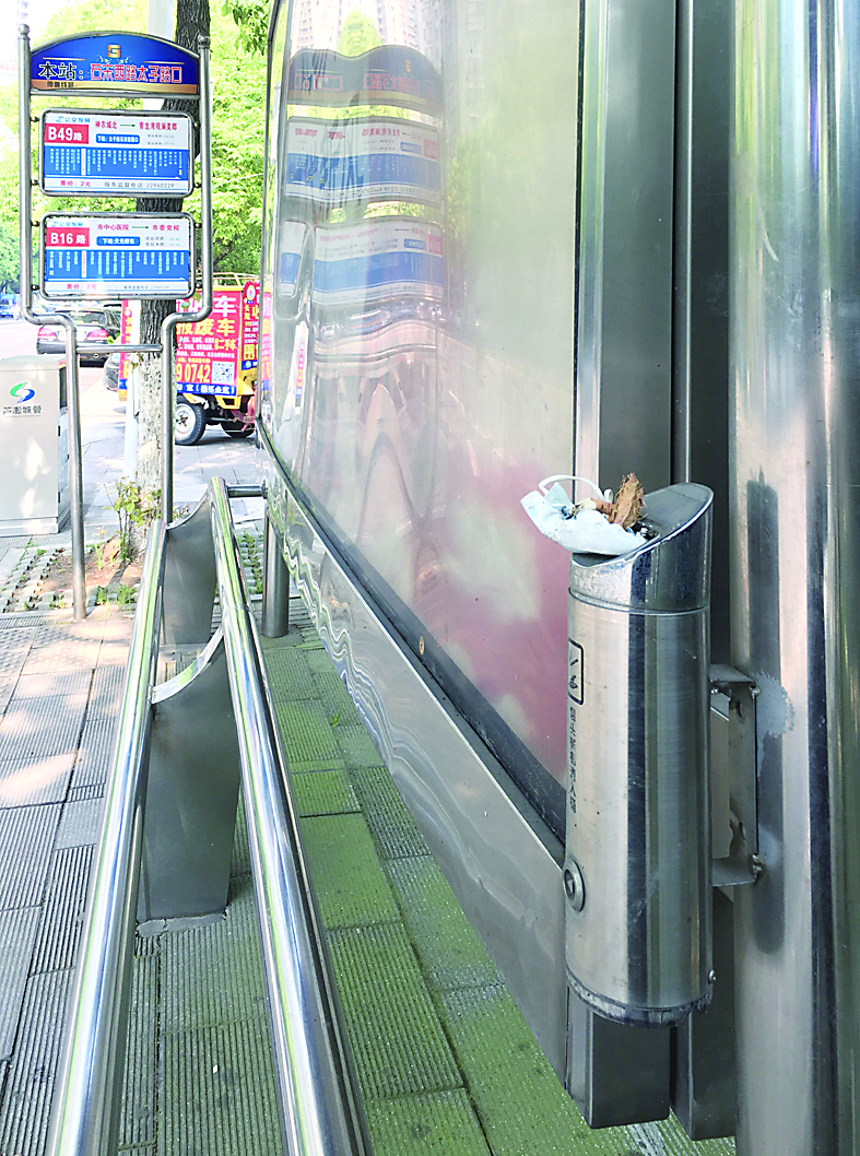 部分公交车站,存在乱扔垃圾现象。有小型垃圾桶被废弃口罩堵塞,有灭烟柱被塞满废纸等垃圾。