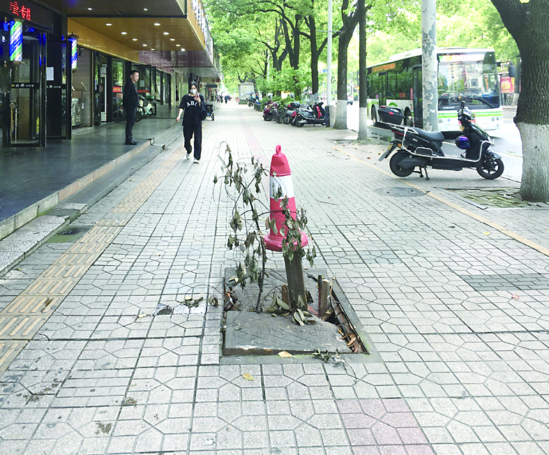 ◀井盖破损处插上了树枝。 记者/刘平 摄