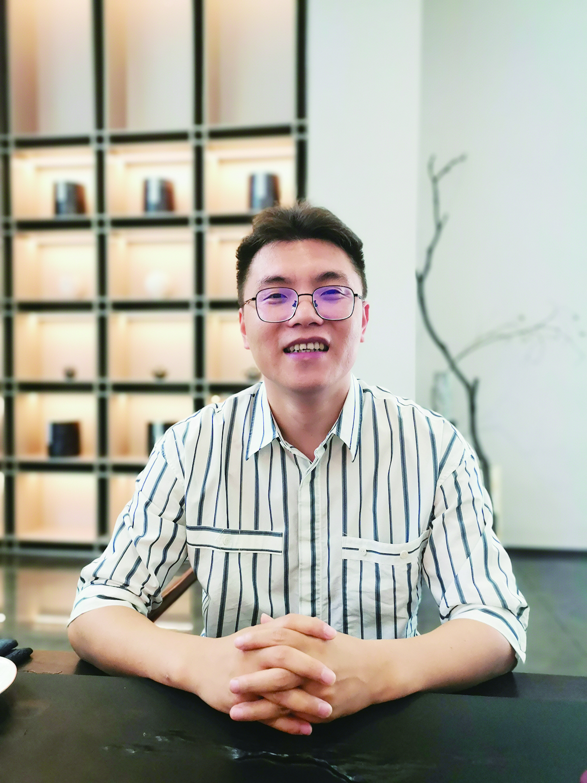 穿过尚格八期·阅天下营销中心精致的中式园林,经旋转楼梯进入地下室,室内装饰沉稳内敛中透出时尚,与正在办公的胡攀身上透出的气场极为相似。