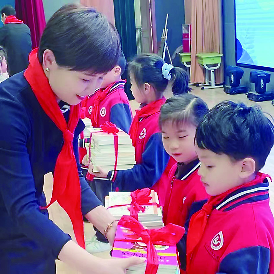 ◀校长曾玉珺赠送书籍给学生。记者/刘文 摄